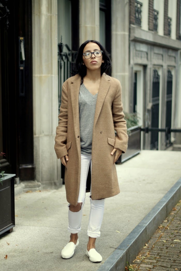 Even though summer started, we have had some chilly days over here. That means: pulling our coats out of the closet and trying to wear them in a way that still fits the summerperiod. This camel, grey, white colored ensemble came out of my creativity and it turned out to be a comfy 'chilly midsummerday' outfit. The jeans I ripped myself and I was kinda happy with the result..